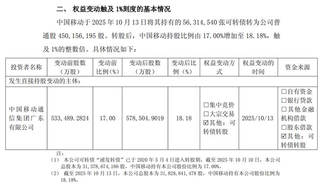 具体情况如下:中国移动于2025年10月13日将其持有的56,314,540张可转债按照每股人民币12.51元的价格,转为浦发银行普通股450,156,195股。转股后,中国移动持股比例由17.00%增加至18.18%。