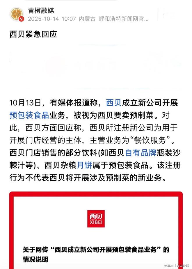 对此,西贝方面回应称,西贝所注册新公司为用于开展门店经营的主体,主营业务为“餐饮服务”。西贝门店销售的部分饮料(如西贝自有品牌瓶装沙棘汁等)、西贝杂粮月饼属于预包装食品。该注册行为不代表西贝将开展涉及预制菜的新业务。