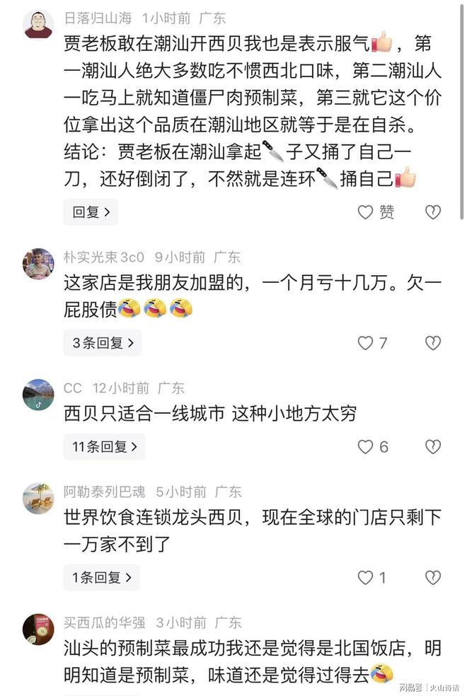 有网友分析,贾老板敢在潮汕开西贝我也是表示服气。第一,潮汕人绝大多数吃不惯西北口味。第二,潮汕人一吃马上就知道僵尸肉预制菜。第三,就它这个价位拿出这个品质在潮汕地区就等于是在自杀。结论:贾老板在潮汕拿起刀子又捅了自己一刀,还好倒闭了,不然就是连环刀捅自己。