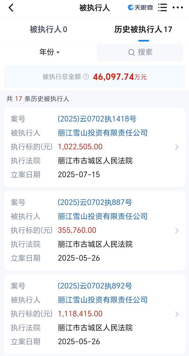 丽江雪山投资有限责任公司被执行总金额超4.6亿