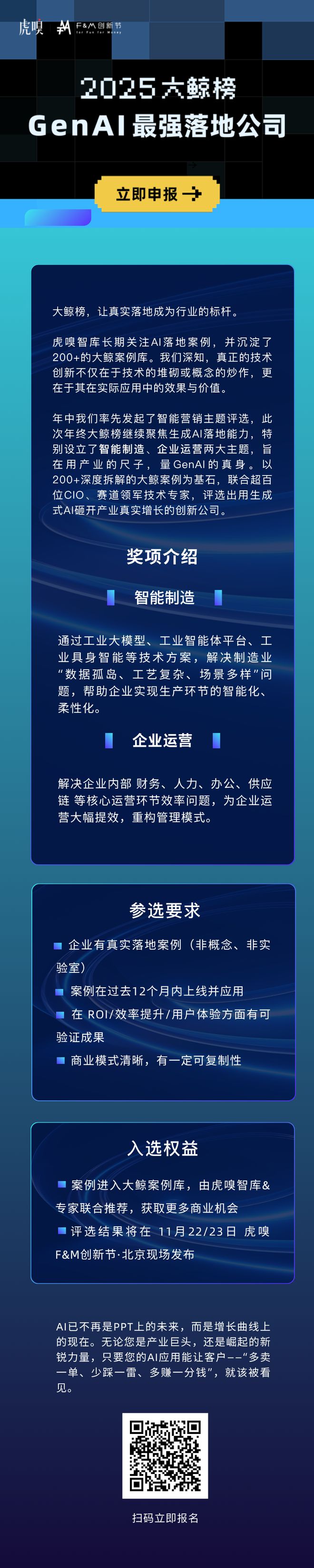 这让“大鲸榜”的权威不在名头,而在它如实记录AI在中国企业的落地进程。无论您是龙头企业,还是AI新星,只要您的产品能真的帮助客户降本增效、业务增长,都有机会登上这个年度AI落地风向标。