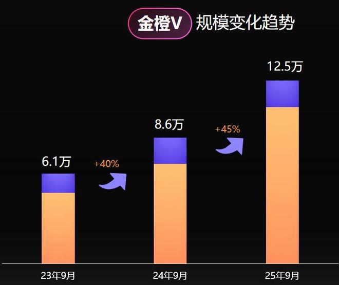 而在创作者生态上,优质创作者继续增长:今年9月,金字塔顶端的金V保持在1.8万人的规模;次一级的橙V大幅增长至10.7万人,相比去年同期增长57%。