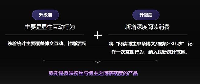 以往,粉丝是否为“铁粉”,主要考量博文互动、社群活跃等显性行为。但平台注意到,一些用户并不喜欢互动,而是倾向于长时间地阅读博文。今年,微博将深度阅读行为纳入“铁粉”规则统计;粉丝就算只看不转、只看不评,一样能够晋升“铁粉”,外化为影响力。