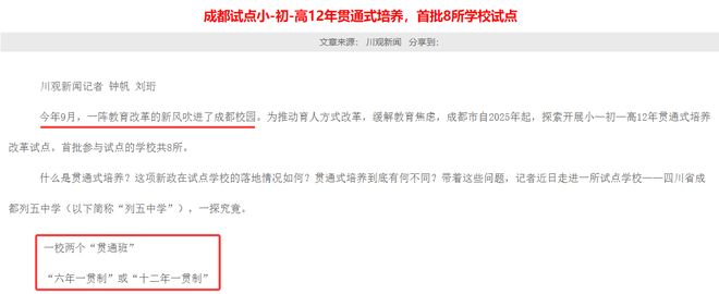 不过,这只是试点,开展十二年贯通式培养的有5所学校,开展六年贯通式培养的有6所学校,这次试点的学校中,公办和民办都有,还有名校,比如成都市实验外国语学校。