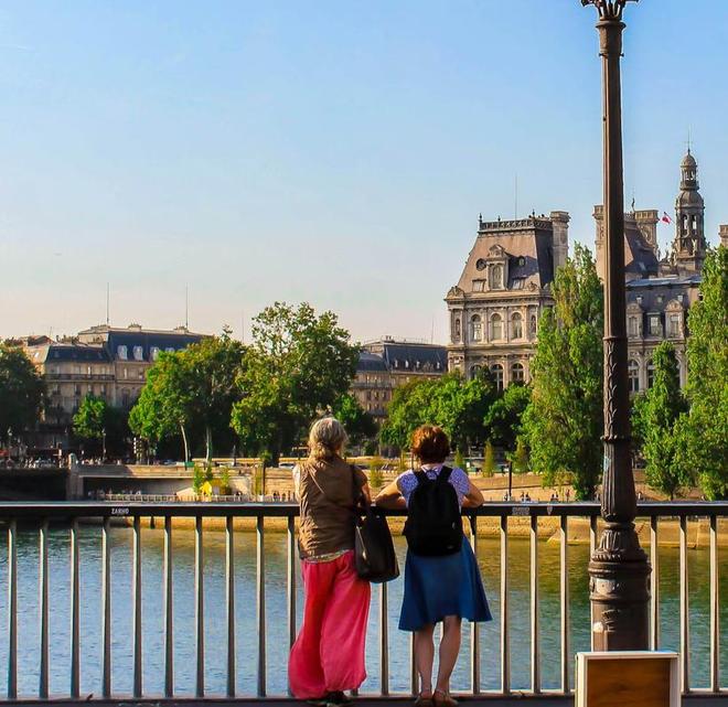巴黎塞纳河畔驻足的行人