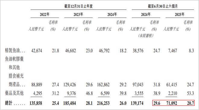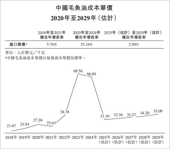 招股书显示,2018年以来国内毛鱼油成本进入了快速增长通道,2023年及2024年受到南美洲收紧捕捞配额及终端产品需求增加影响,成本单价达到了66元/千克以上,预估2025年会大幅回落。而毛利率大降更多源自此前采购的高价原材料。