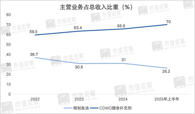 财报显示,早在2022年禹王生物营养的精制鱼油业务实现收入1.96亿,占营收比重为36.7%,但此后占比一路下滑,到今年上半年已经降至26.2%。而同期CDMO膳食补充剂的收入占比则由59.5%提升至70%。