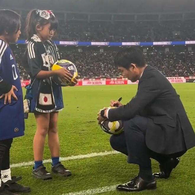 你有没有发现一个细节,当赢下比赛,创造历史之后,森保一没有先庆祝胜利,而是快步走向场边,蹲下身耐心给小球迷签名合影。