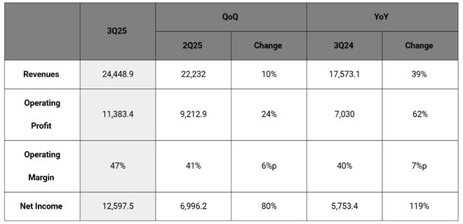 - 财务表现:三季度营收24.45万亿韩元(约171亿美元),同比增长39%;运营利润11.38万亿韩元(约80亿美元),同比暴增62%,净利润12.598万亿韩元,均创历史新高。