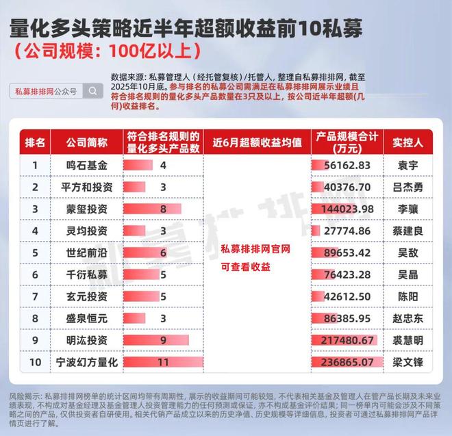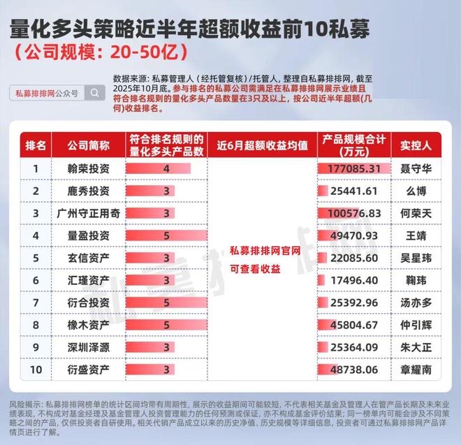 整体来看,近半年量化多头产品的超额波动较为剧烈,在此背景下,哪些私募能够在量化多头产品表现上更为出色?为了给予更多有价值的信息,笔者按公司规模分类(100亿以上、50-100亿、20-50亿、0-20亿),梳理出了各规模组量化多头策略近半年超额收益前10强私募。(统计样本:截至2025年10月底,在私募排排网上至少有3只量化多头产品符合排名规则且均有近半年收益展示的私募;本文中“超额收益”指超额收益(几何),下同)