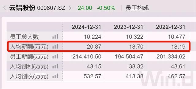 截至2024年末,云铝股份职工总数超过1万人,去年人均创利43万元,今年有望继续提升;去年人均税前薪酬直奔21万元,比2023年增加2万多元。