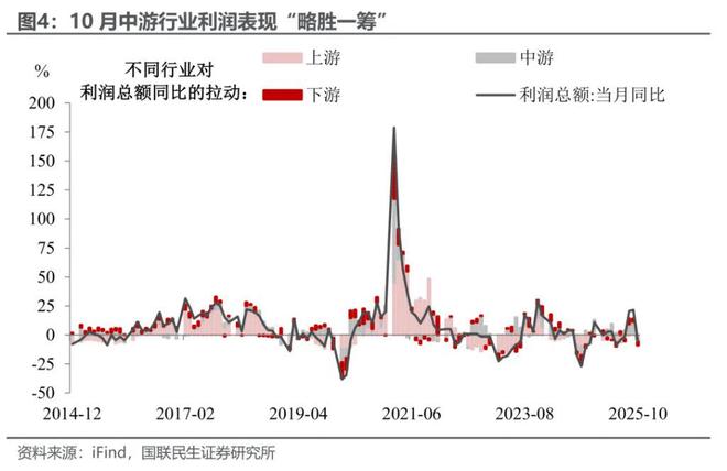 在这一过程中,中游行业利润表现“略胜一筹”。10月上、中、下游行业利润同比增速依次为-12.0%、-4.8%、-13.9%(9月依次为5.0%、21.8%、10.0%),整体而言中游利润表现“略胜一筹”。随着“反内卷”政策的推进,利润更多由定价权和技术壁垒决定,中游制造业的龙头企业和部分技术驱动的下游企业有望胜出,而部分单纯依赖资源的上游和缺乏议价能力的下游企业将承压。