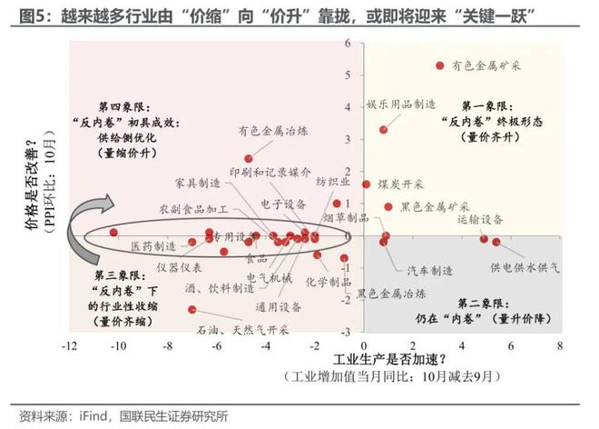 聚焦于具体行业来看,同样释放了“反内卷”迈入新阶段的重磅信号。结合此前我们提出的“反内卷”四象限加以观察,虽然10月仍有众多行业处于第三象限(即“量价齐缩”),但与此前不同的是,越来越多行业开始悄然由“价缩”向“价升”靠拢。若后续能成功实现这“关键一跃”,意味着“反内卷”将迎来关键成效、也会推动企业利润增速迎来显著改善。