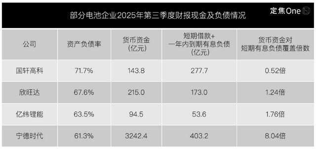 结合货币资金与短期有息负债的对比,更能看出差距:宁德时代手握的现金是有息负债的8倍以上;欣旺达账上215亿现金中,短期要还的债就有173亿;国轩高科的现金甚至已覆盖不了短期债务。