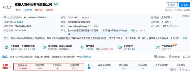 此外,泰康人寿风控能力也有待提高。天眼查显示,泰康人寿自身风险222条,周边风险 4162条。