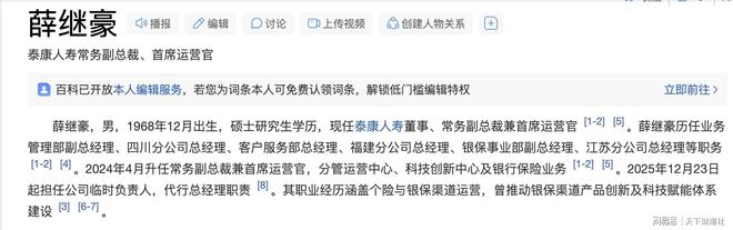 目前在百度百科上,薛继豪的职务仍为泰康人寿常务副总裁、首席运营官。