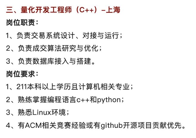 与传统金融岗位“学历+从业年限”的路径不同,量化私募对新人的筛选更接近科技公司。许多机构在公开招聘中将“985硕士/博士”、“编程竞赛获奖”、“顶级会议论文一作”等作为重要参考,部分岗位甚至直接以GPA和科研成果作为硬指标。