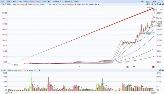 然而,经过10月的短暂调整,11月再度大涨58%,12月再涨48%。全年拉通来看,2025年天普股份涨幅竟然高达1663%,位列全年个股涨幅榜第二。