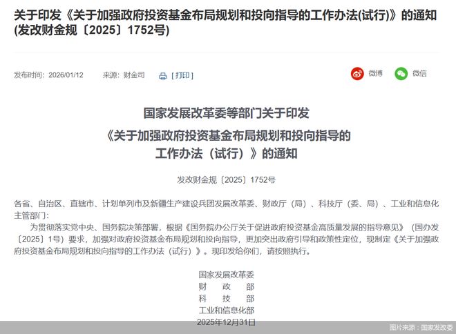 政府投资基金迎来重磅新规。1月12日,国家发展改革委、财政部、科技部、工业和信息化部联合发布《关于加强政府投资基金布局规划和投向指导的工作办法(试行)》(以下简称《工作办法》)。同日,国家发展改革委也出台了关于《政府投资基金投向评价管理办法(试行)》(以下简称《管理办法》)的通知。两份文件均自发布之日起实施,有效期5年。有业内人士指出,尽管政府投资基金规模快速增长,但实践中也暴露出结构性问题,例如投向同质化、定位模糊等。新规通过顶层设计优化、激励机制重构与操作规范升级,推动政府投资基金从"规模扩张"有效转向"质量优先"。