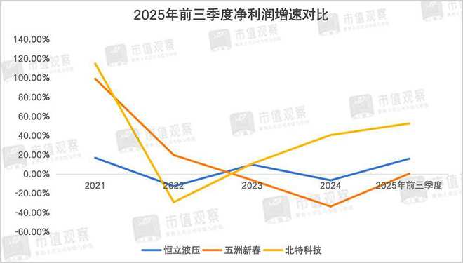 在财务和成长性对比上,恒立液压体量最大,是妥妥的白马蓝筹股。2025年前三季度三家的营业收入虽然均在十亿级别,但净利润率却相差甚远,恒立液压、五洲新春以及北特科技分别为26.85%、4.1%和5.67%,盈利能力差异明显。