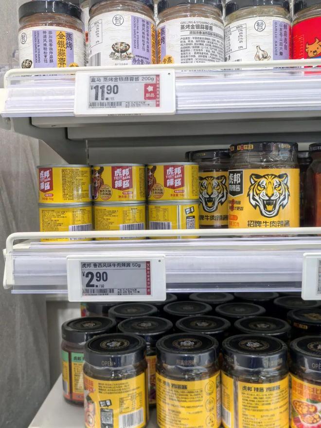 广州一家知名连锁超市里的虎邦辣酱,这家新派辣酱品牌靠“外卖赠品”虏获年轻消费者。(图/良豪摄)