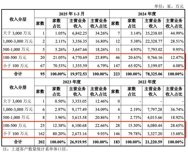 具体表现为,2022年至2024年,头部客户收入贡献显著,前10%左右的客户贡献75%左右的收入。但2023年和2024年,公司收入在500万元以下的客户数量占比均在90%左右,但贡献收入均在30%左右。2024年度公司100万元以下的客户数量占比65.92%,仅贡献4.08%的收入。