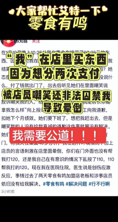 视频中,一名女子躺在病床上讲述,1月10日晚10时25分,她在零食有鸣商店购买了93.25元的商品,因发现有优惠券,故询问店员能否分两次支付。
