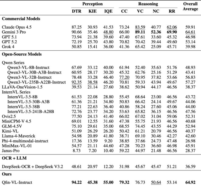 但回到真实的信贷场景,以统一的综合指标开展横向比较时,奇富科技自研的信贷垂类多模态大模型Qfin-VL-Instruct,拿下了全模型最高分。