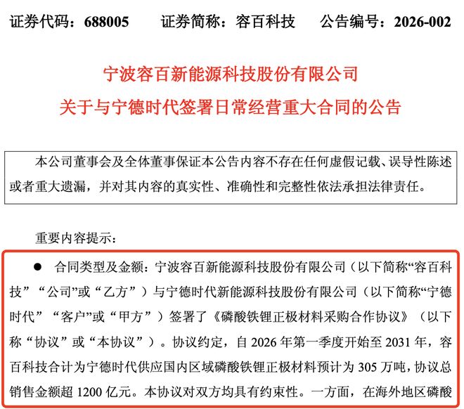 1月13日,容百科技发布公告称,公司与宁德时代新能源科技股份有限公司签署了《磷酸铁锂正极材料采购合作协议》。协议约定,自2026年第一季度开始至2031年,容百科技合计为宁德时代供应国内区域磷酸铁锂正极材料预计为305万吨,协议总销售金额超1200亿元。本协议对双方均具有约束性。