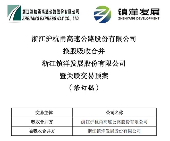 近日,镇洋发展(603213.SH)公告称,公司控股股东浙江省交通投资集团有限公司(以下简称“浙江交投集团”)拟筹划浙江沪杭甬和镇洋发展进行重大资产重组,交易方式为浙江沪杭甬向镇洋发展全体股东发行A股股票,通过换股方式吸收合并镇洋发展。