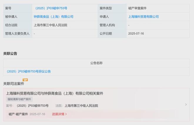 2025年7月16日,天眼查显示,钟薛高食品(上海)有限公司新增一则破产审查信息,申请人为上海臻料贸易有限公司,经办法院为上海市第三中级人民法院。