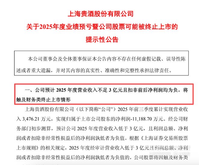 红星资本局1月13日消息,昨日晚间,*ST岩石(即上海贵酒)公告,经公司财务部门初步测算,预计公司2025年度营业收入低于3亿元,且利润总额、净利润或者扣除非经常性损益后的净利润孰低者为负值。