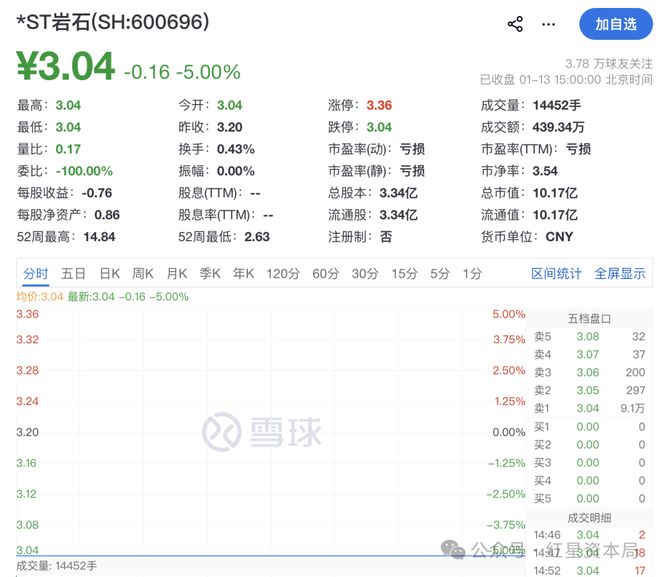 13日开盘后*ST岩石迅速一字跌停,报3.04元/股