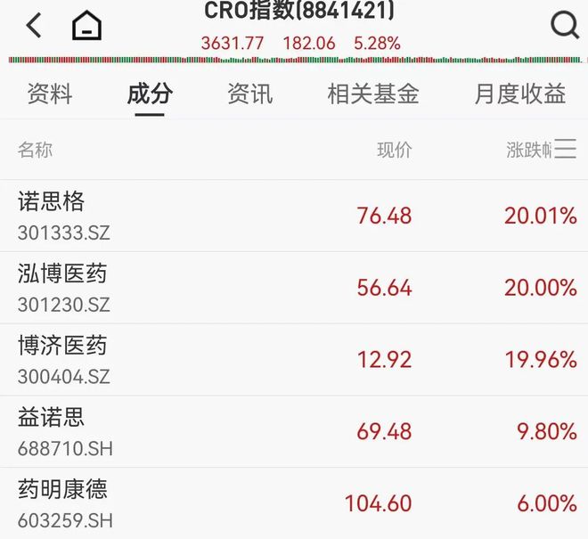 医药股普涨,据Wind,重组蛋白、CRO及医疗服务等方向领涨,百花医药、博济医药等多股涨停。