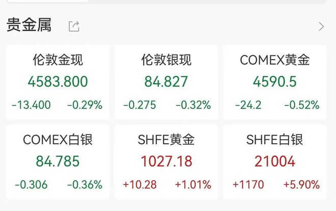 金银价格新高,黄金股领衔有色金属股上涨,明牌珠宝涨停,湖南白银逼近涨停,招金矿业、紫金矿业、中国黄金国际均创历史新高。截至发稿,黄金、白银小幅跳水,现货黄金失守4590美元/盎司,现货白银失守85美元/盎司。
