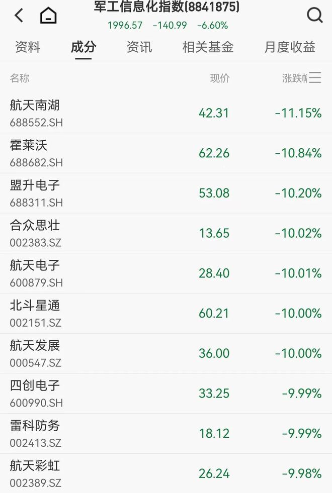 个股方面,上涨股票数量超过1600只,逾70只股票涨停。商业航天概念股重挫,板块中逾60只股票跌停或跌超10%,航天电子、北斗星通等多只军工股封板跌停。