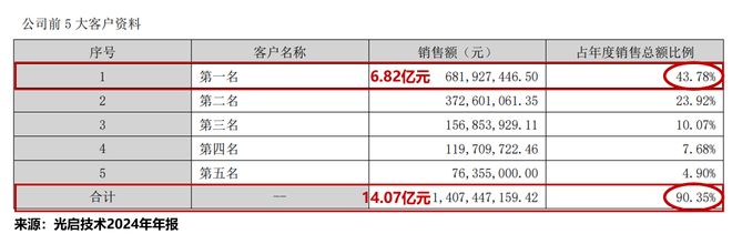 以2024年为例,光启技术的前五大客户贡献了14.07亿元营收,占总营收的90.35%;其中,第一大客户的销售额占比便高达43.78%