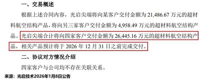 1月8日,光启技术公告称,其全资子公司光启尖端近期累计与四家客户签订了合计2.64亿元的超材料产品批产合同,相关产品预计将于2026年底之前完成交付。