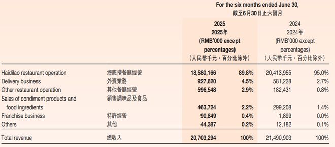 首先是营收增长乏力。2025上半年海底捞营收207.03亿元,同比下降了3.66%,主要受餐厅经营收入下滑拖累;
