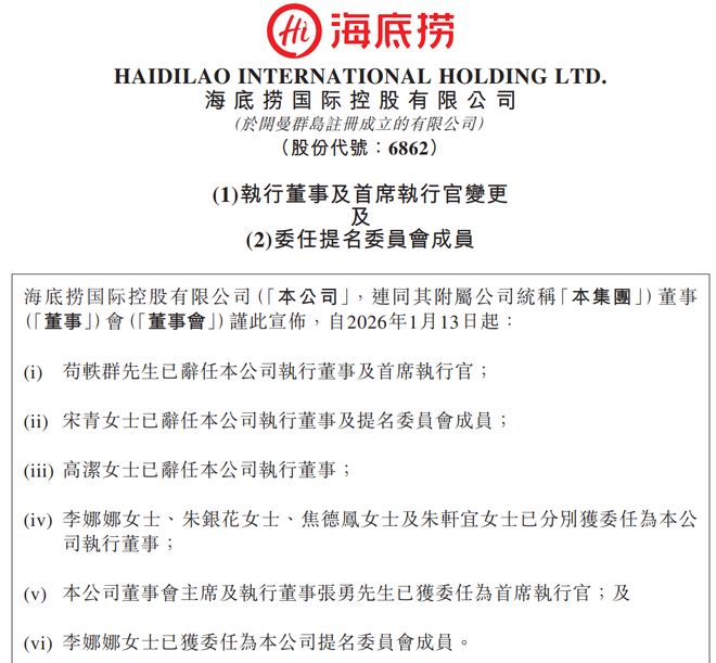 1月13日,海底捞发布公告:CEO苟轶群辞任,创始人张勇接替其职;宋青、高洁辞任执行董事,李娜娜、朱银花、焦德凤及朱轩宜四位女性高管同时进入董事会。