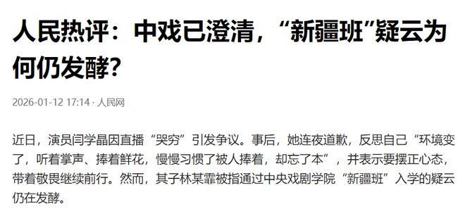 中戏简单否认有“新疆班”,却不公示林某霏入学当年的录取名单及具体分数,让人觉得说服力不足。而林某霏在回应学籍争议时,也只是简单说了一句网传不实,对报考资格、户籍学籍等核心问题,避而不谈。包括闫学晶的道歉信,也没提到儿子的学籍问题。