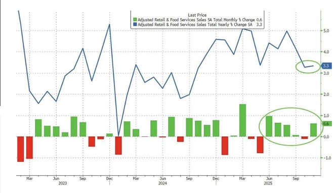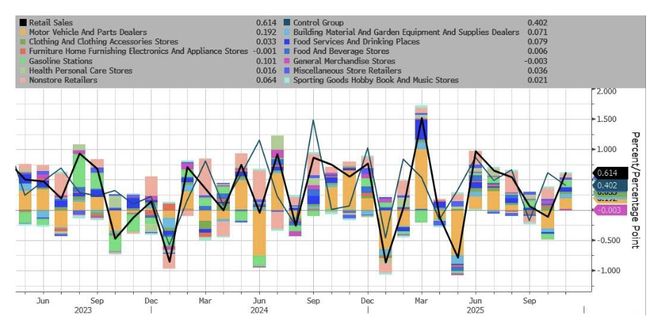 从细分数据来看,汽车销售与加油站收入对整体增长贡献最大,但百货商店和家具店的销售则出现下滑。汽车销售的反弹尤为明显,此前在10月,因联邦电动汽车税收抵免政策到期,该类别销售曾受到抑制。此外,加油站收入的增加也为整体增长提供了支撑。