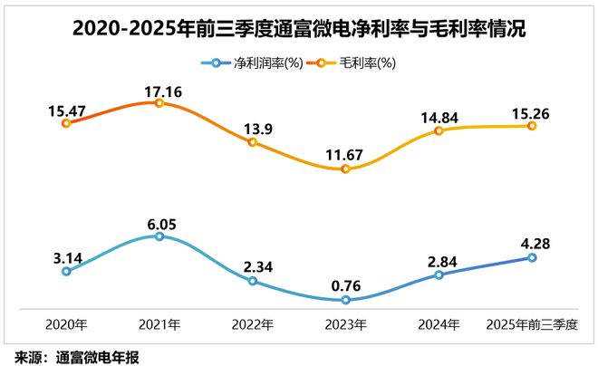 2020-2025年前三季度,通富微电的毛利率始终在20%以下水平,远低于行业平均水平(35%);净利率也在最高也才6.05%,最低仅有0.76%。