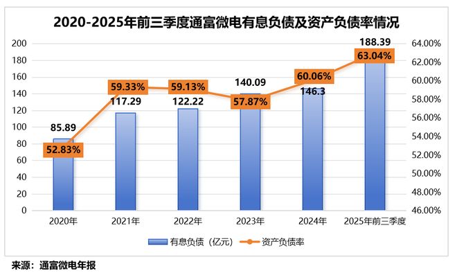 截至2025年三季度末,公司有息负债高达188.39亿元,资产负债率也从2020年的52.83%攀升至63.04%。