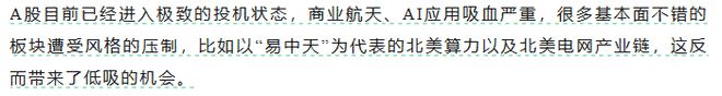 周一我还提示大家,由于市场投机盛行,小票风格压制了机构票,反而给了一些业绩不错的板块机会,以电网设备为代表的北美电力产业链连续两天走强,杰瑞股份涨停,半导体板块大涨,今天午盘题材股跳水后,海外算力也企稳反弹。