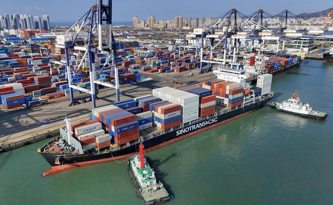 我国外贸不仅在规模上实现突破,更在结构优化和质量提升上展现出诸多亮点。图为集装箱货轮靠泊山东港口烟台港。(图片由CNSPHOTO提供)