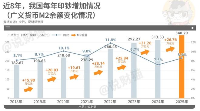 关于印钞总量,截至2025年底,广义货币M2余额达到340.29万亿。