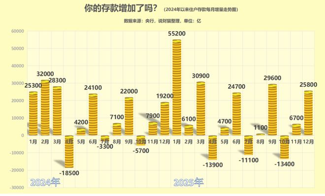 2025年,住户存款累计新增了14.64万亿,和上一年基本持平(2024年为14.26万亿)!