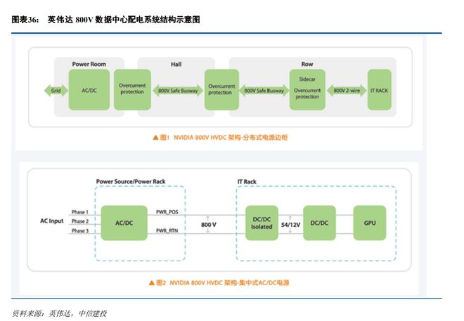 报告深入解读了英伟达发布的 800V 供电白皮书,认为这为行业确立了清晰的演进路径。英伟达规划的路线图显示,供电方案将经历从“交流”到“800V 直流(过渡)”,再到“800V 直流(Sidecar 方案)”,最终演进至“固态变压器(SST)”的终极形态。