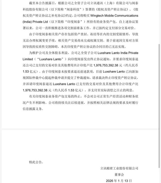 1月13日晚间,立讯精密公告称,因印度闻泰相关资产存在查封、冻结等交割受限情形,无法办理权属变更手续,相关交易尚未完成资产权属交割。由于上述障碍系交易对方原因导致,本次印度资产转让协议的合同目的已无法实现。